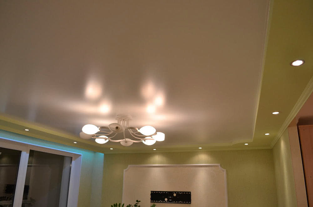 Правильное освещение подчеркивает красоту и декоративность натяжных потолков. Особенно это касается многоуровневых конструкций, в частности, двухъярусных