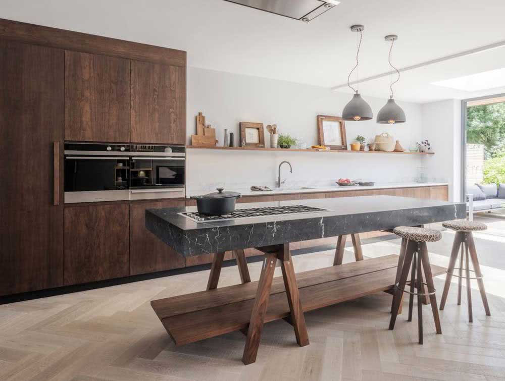 Еще одной тенденцией, которая уже начала проявляться достаточно сильно, являются натуральные деревянные фасады кухонных шкафов. Многие больше не хотят скрывать естественный вид дерева под краской, шпоном и ламинатом, поэтому показывают фактический оттенок и зерно. В значительной степени эта тенденция проистекает из эко-моды, но также из-за стремления к природе.