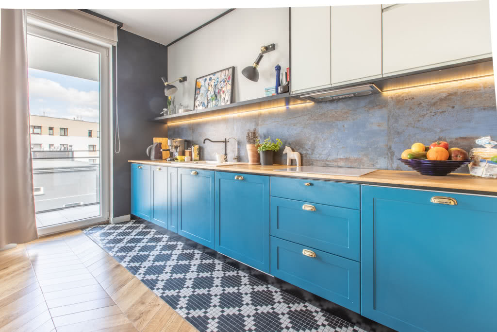 При оформлении фартука необходимо учитывать, что он будет заходить на несколько сантиметров под кухонную мебель – используйте этот факт при покупке материалов.