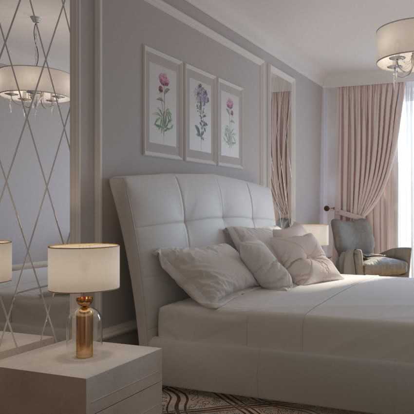 На фото интерьер спальни со стеной, декорированной хаотичными рамками из молдингов.