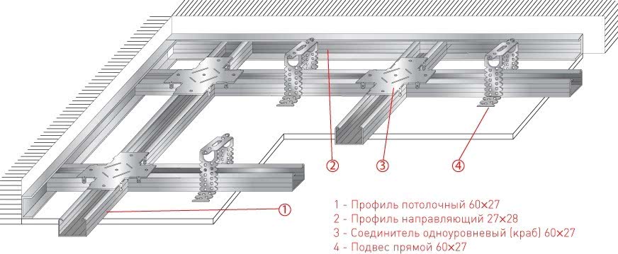 Обрешетка из металлопрофиля. Направляющий профиль, потолочный профиль и подвес. Так они выглядят если исключить из рисунка другие элементы.