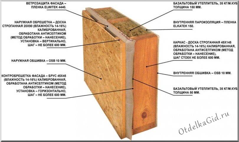 Между стойками каркаса укладывается утеплитель. Поверх стоек и утеплителя крепят ветро- и гидроизоялционную мембрану, легко пропускающую влагу. Далее крепится обрешетка и на неё ОСБ плиты.
