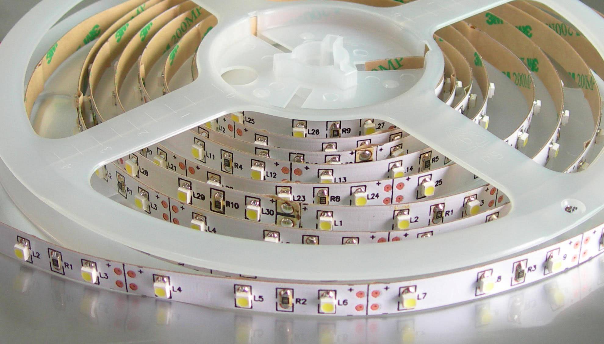 Посмотрите на плотность расположения лампочек. Она бывает 30, 60, 120 штук на метр. Специалисты советую для контурной подсветки брать ленту с 60 или 120 диодами, а вот для направленного освещения лучше всего подойдет лента на 30. Определитесь с мощностью ленты – по этому показателю они тоже бывают разные. Для направленной подсветки купите модель 5 Вт/м, а для контурной лучше взять побольше – 8 Вт/м. Чтобы сэкономить на контроллерах (купить более дешевые), на откосы ставят ленты 5 и 7 ВТ, а на полочку – 7 и 14 Вт. Определить мощность ленты поможет ее маркировка, которая имеет буквенный и цифровой код, например, SMD 3028