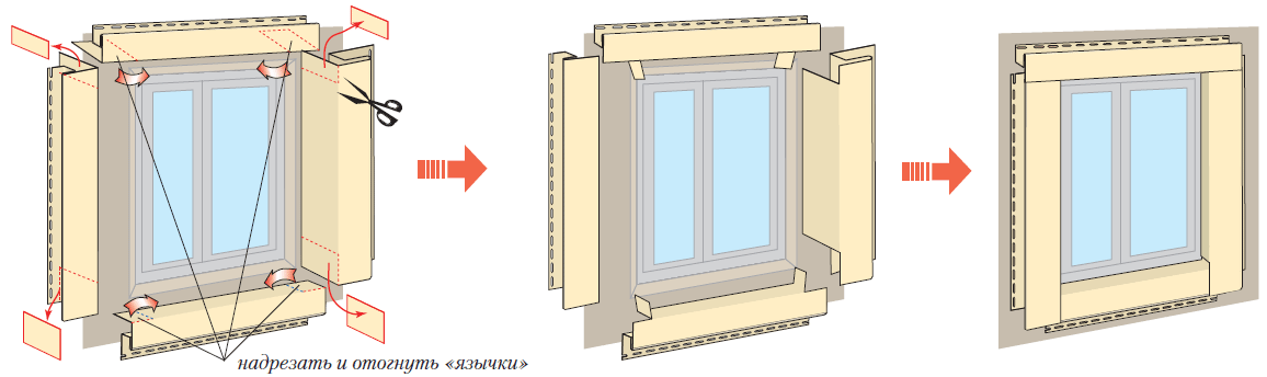 Наличники раскраивают таким образом, чтобы их длина соответствовала высоте и ширине проема плюс две высоты виниловых профилей, которые были выбраны для данной обшивки. Сначала устанавливают верхний профиль. С обеих сторон на нем делают надрезы, равные по высоте виниловым профилям. Надрезанную часть отгибают вниз, чтобы образовался «язычок». Они нужны, чтобы отводить воду с верхнего профиля в боковые. Затем берут боковые профили и вводят их в вырезанную часть верхнего профиля. В верхней части боковых наличников вырезают кусочки винила, чтобы «язычки» верхнего профиля вошли внутрь боковых.