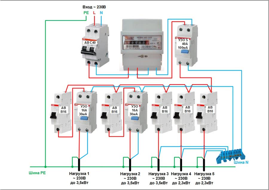 Также в щитке устанавливаются две шины: заземления и зануления. На шину заземления заводятся все заземляющие провода от приборов и устройств. На «нулевую» шину провод приходит от УЗО, и подается на соответствующие входы автоматов. Обозначается ноль обычно буквой N, при разводке принято использовать синий провод. Для заземления — белый или желто-зеленый, фазу ведут красным или коричневым проводом.