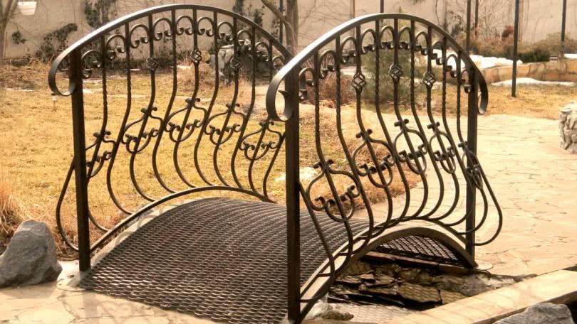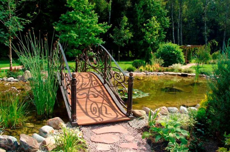 Пруд с мостиком на участке особенно удачно смотрится при использовании металлических кованных конструкций. Подобные мостики могут быть выполнены в самых разных стилях и иметь отдельные кованные элементы, придающие конструкции роскошный вид.