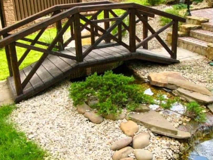 Для строительства мостика можно использовать любые подручные материалы. Главное, чтобы они подходили под общий стиль участка и были достаточно прочными.