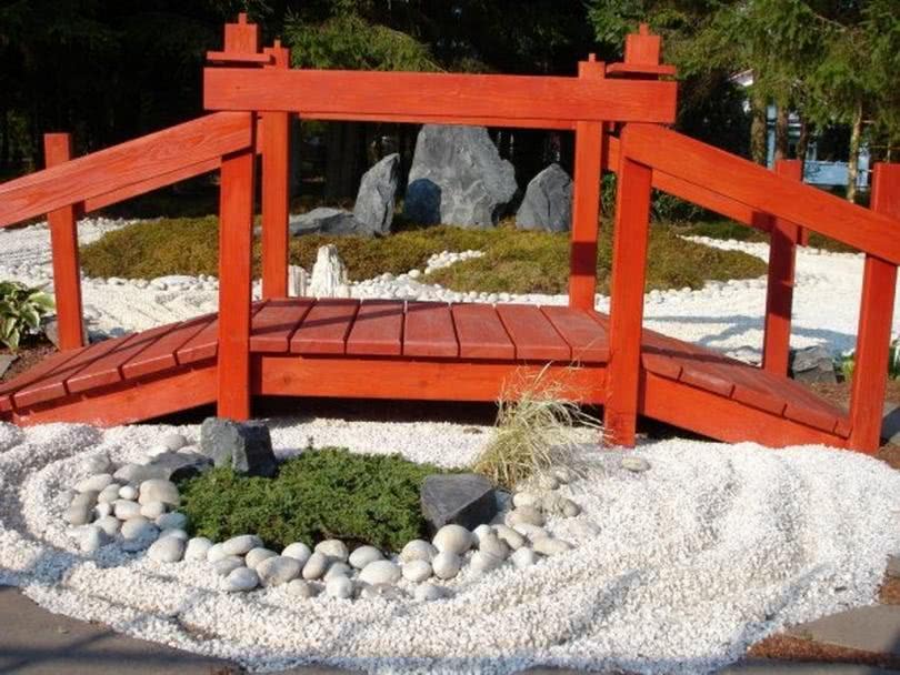 Тем, чей участок выполнен в восточной направленности, приглянутся мостики зигзагообразного типа. С древних времен такая форма выполнялась для того, чтобы защитить участок и его хозяев от злых духов, которые, согласно поверьям, не могли найти выхода из-за конструкции в виде зигзага.