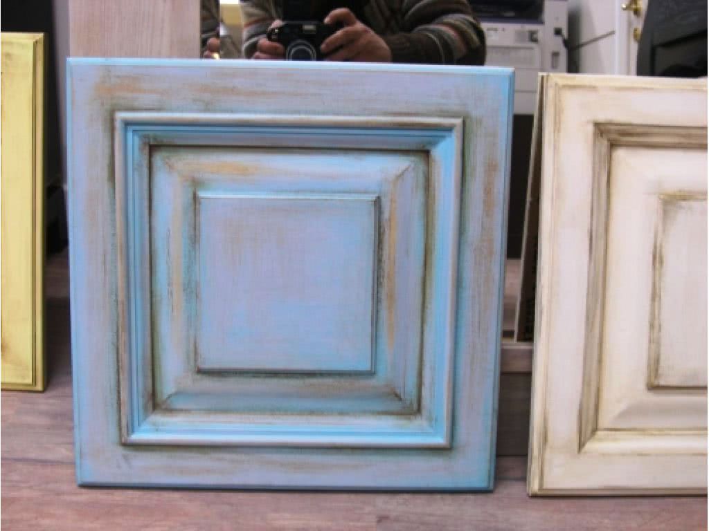 Интересный вариант для фасадов из древесины или МДФ — состаривание. Самый простой вариант — морение. Старый лак полностью снимается, наносится слой морилки. Эффект старины достигается смыванием морилки на отдельных участках (чаще всего в средней части полотен). После полного высыхания дверки шлифуются, на участки, которые должны быть темнее, наносится второй слой морилки, изготовленной на другой основе. После высыхание вдоль волокон втирается воск, поверхности шлифуют, используя мягкую ткань.