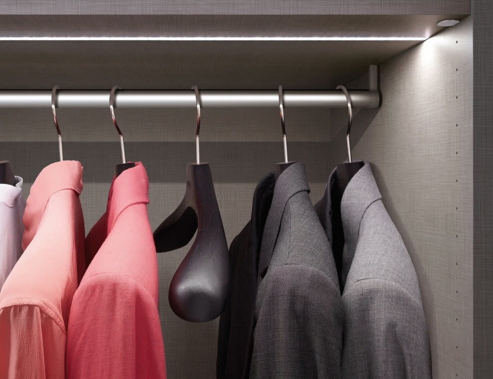 Для встроенной подсветки полок и вешалок лучше использовать светодиодные светильники