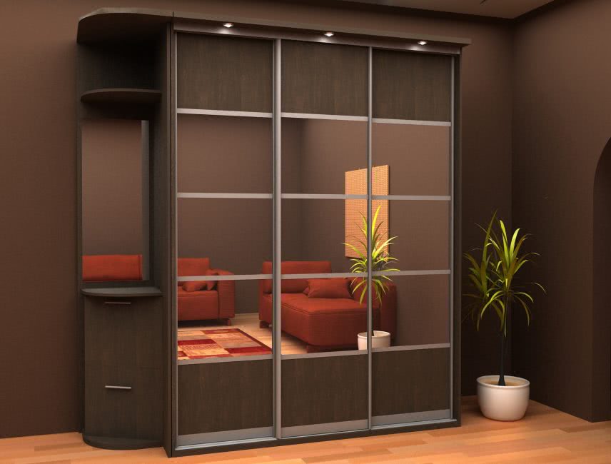Дизайн шкафа для прихожей лучше выбирать с зеркалом на двери. Это поможет визуально расширить пространство коридора и даст возможность видеть себя в полный рост непосредственно перед выходом из дома.
