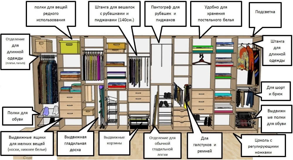 Стандартный набор комплектующих состоит из полок, штанги под вешалки, полочки для обуви из сетчатого материала, корзины с роликовыми направляющими и ящики выдвижного формата. Варианты могут быть разнообразными: