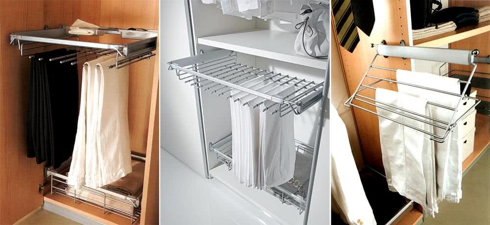 - брючницы стационарного или выдвижного типа. Предназначены для бережного хранения брюк. В равной степени относятся к встроенным и дополнительным элементам наполнения шкафов;