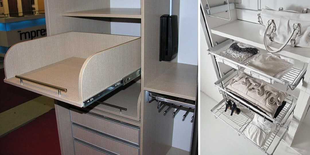 К традиционной фурнитуре также относятся выдвижные секции, которые могут быть изготовлены не только из металла, но и из дерева, стекла и пластика. Эти системы пригодятся для хранения любых вещей: от галстуков и бабочек до постельных аксессуаров и одеял.