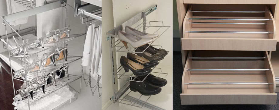 Обувница. Может быть представлена каскадной системой из нескольких сетчатых полок, расположенных под углом с противоскользящими ковриками. Для установки в шкафу необходимо располагать отсеком с глубиной около 500 мм.