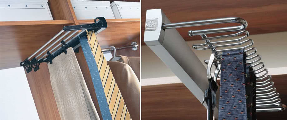 Держатели для брюк и ремней также являются незаменимой частью современного шкафа-купе. Различают несколько механизмов, в числе которых поворотный, полновыкатной, полновыкатной бокового крепления и вешалка. Держатели для галстуков выполнены в форме небольшой штанги с крючками или петлями. Их основное отличие друг от друга — число крючков.