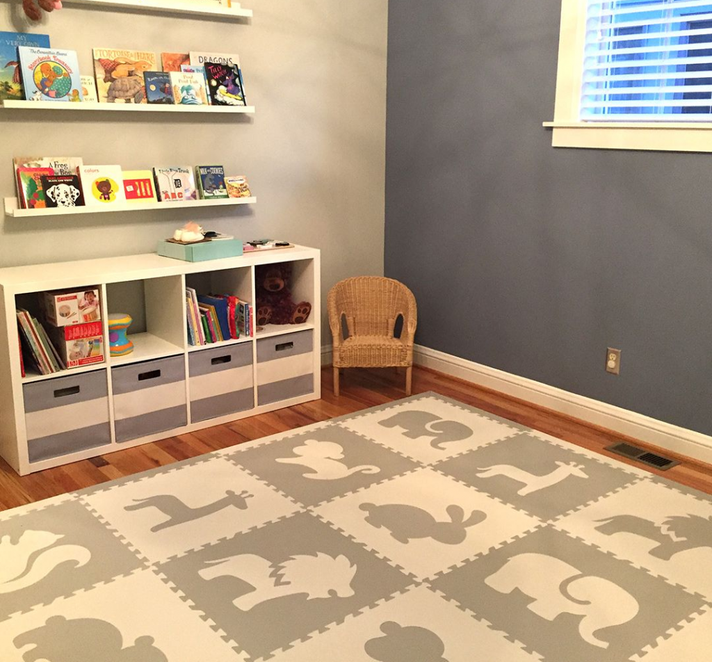 Можно создать интересные композиции и покрыть им не весь пол, а только игровую, для которой ковролин подходит идеально. В комнате для маленьких детей будет уместно в этой зоне покрытие-пазл из вспененных полимеров.