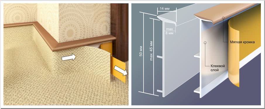 Его вид привлекательный и необычный. Он может прекрасно скрыть прокладку проводов. Металлический вариант имеет превосходные качественные характеристики. Он применяется для финальной отделки полов из ковролина, полиуретановых и прочих.