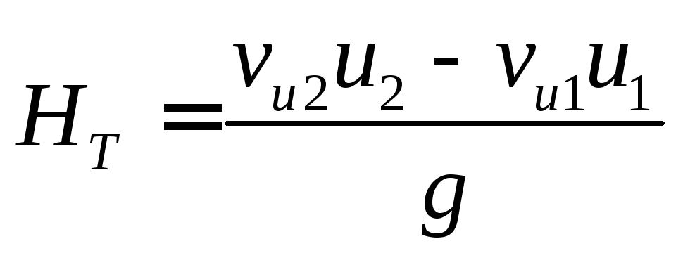 — переносная (окружная) скорость рабочего колеса на входе иu2=R2ω — скорость рабочего колеса на выходе и что проекции векторов абсолютных скоростей на направление переносной скорости (перпендикулярной к радиусамR1 иR2) равныVu2 =V2Cosα2 иVu1 =V1Cosα1 , гдеVu2 иVu1 , получим теоретический напор в виде