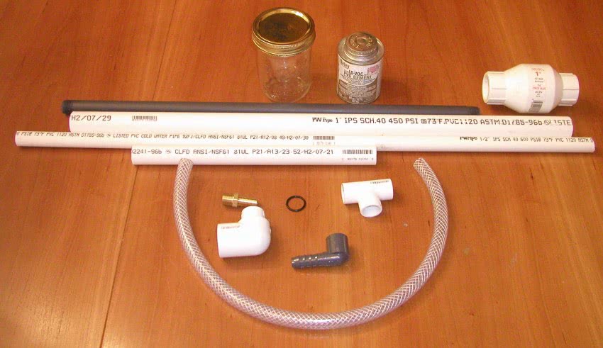 Не у каждого есть возможность сделать водяной насос из металла с использованием сварочного аппарата. При этом реально собрать устройство из недорогих канализационных труб. Такой агрегат поднимет воду с глубины до 3 м. При этом воде не грозит ржавчина, как в случае применения устройства из черного металла.