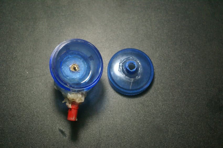 - Поршнем послужит верхняя часть от флакона из-под герметика объемом 340 мл. Хорошенько разогрев, его помещают в гильзу, в результате чего будущий поршень примет необходимую форму. Затем от флакона отрезают большую часть, а верхушку прикрепляют к обратному клапану, установленному в штоке. Для этого следует использовать накидную гайку или бочонок – муфту с наружной резьбой.