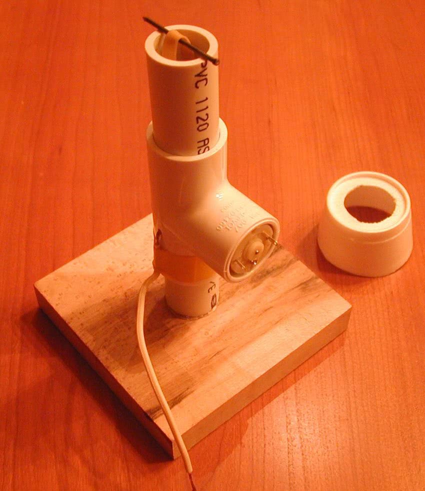 Рабочий цилиндр устройства – труба диаметром 100 мм и длиной 500 мм. Сверху в нее вставляется тройник 100х50х100 мм. В свою очередь. он закрывается крышкой, в которой проделано отверстие и вклеена горловина трубы диаметром 32 мм в качестве направляющей для штока.