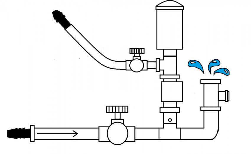 При этом в штоке сразу за обратным клапаном необходимо выполнить несколько отверстий, но так, чтобы труба сохранила достаточную прочность. Теперь шланг необходимо прикрепить к отводу тройника – вода при подъеме поршня будет выходить через это отверстие.