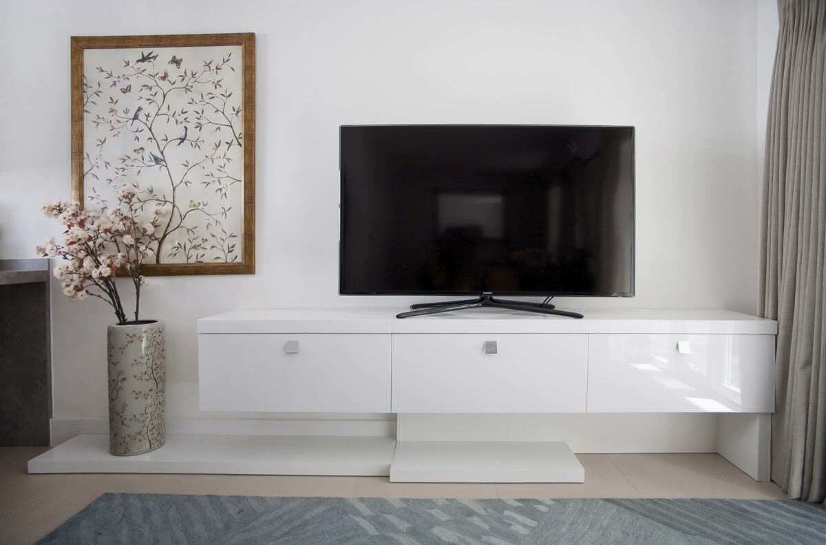 Разделение функциональных поверхностей в комнате: белая стена с длинной черной полкой для телевизора