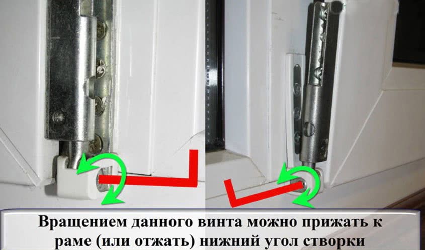 Перекос створки можно устранить регулировкой нижнего и бокового винтов