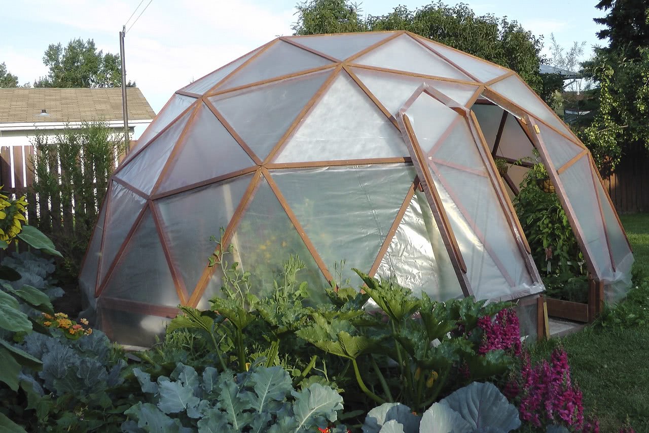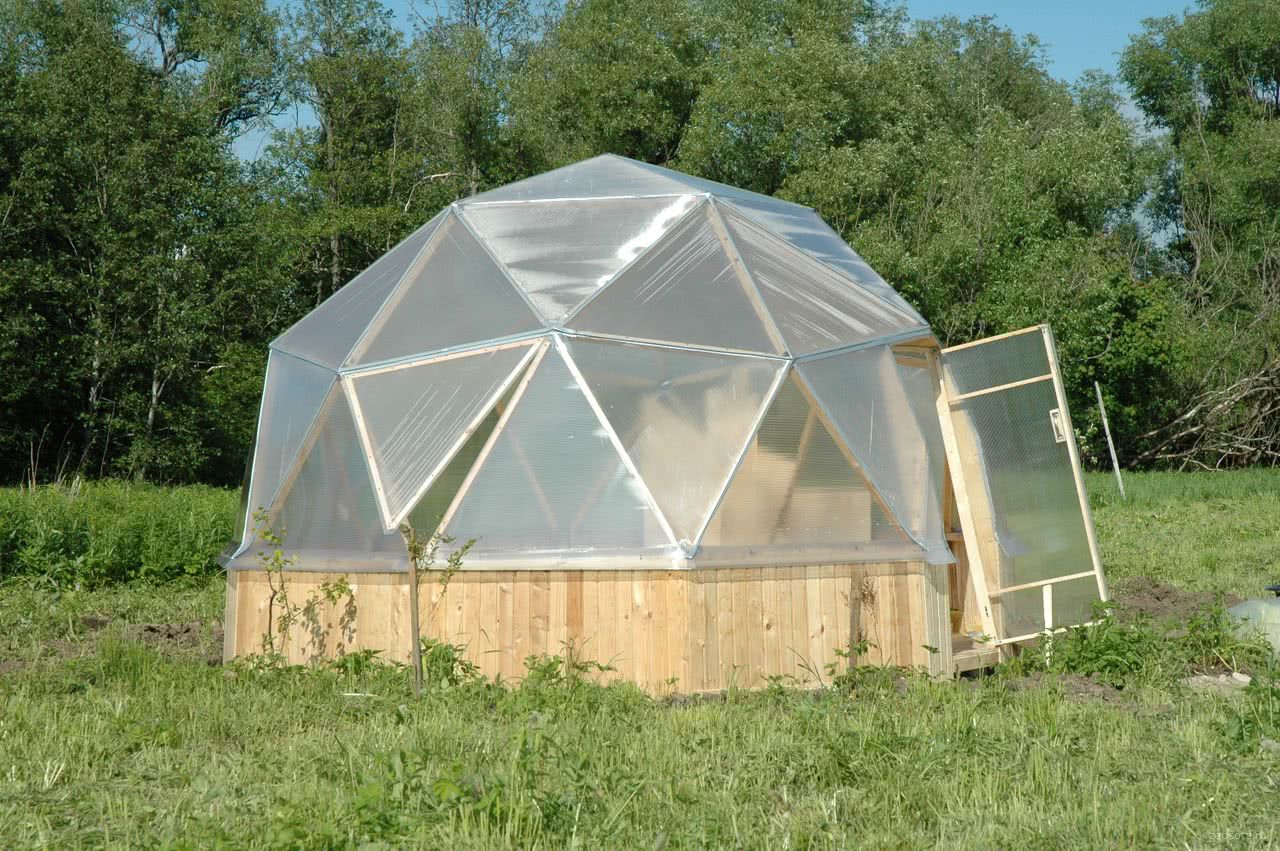 Примером такой формы теплицы для дачи является полусфера, которую легко сделать из треугольных элементов по каркасному принципу. Парник округлой формы выглядит как планетарий. Чтобы придать ему еще большей футуристичности, в качестве рамок выбирают алюминиевые профили.