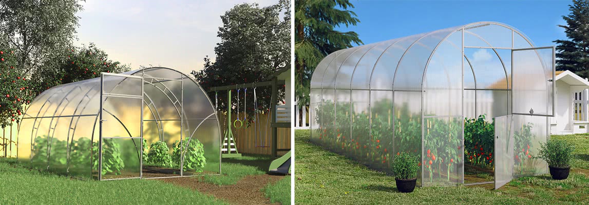 За счет своей легкости и гибкости поликарбонат позволяет создать конструкцию любой геометрической формы (например, можно сделать квадратную теплицу из поликарбоната или коньковую теплицу из поликарбоната).