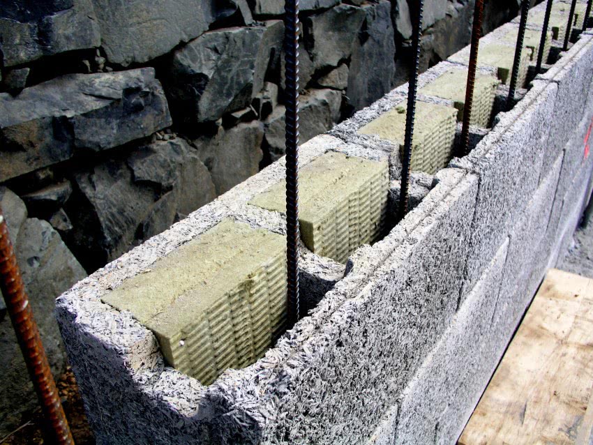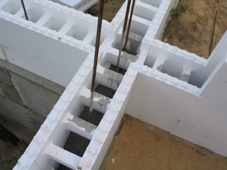 Для того чтобы упростить монтаж арматуры, в каждом блоке предусмотрены специальные пазы, которые находятся в перемычках (внутренних). Горизонтальные прутья монтируются таким образом, чтобы каждый последующий элемент заходил на предыдущий (внахлест). Далее прутья соединяются между собой, а также с вертикальными элементами с помощью специальной проволоки.