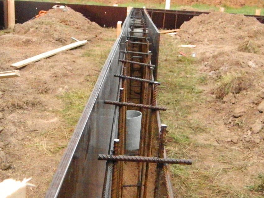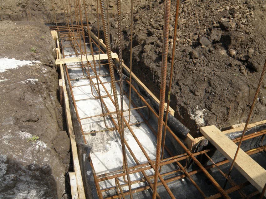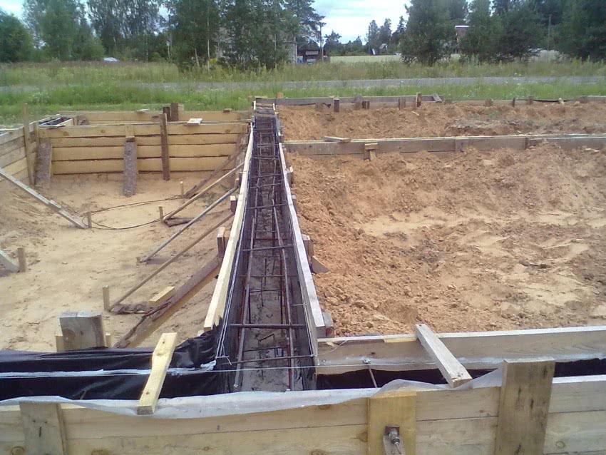 Для обустройства ленточного фундамента под него роется траншея в соответствии с контурами здания и глубиной до 1м. На ее дно укладывается песчаная подушка слоем 10-15см. Песок увлажняется и тщательно трамбуется. Для улучшения характеристик бетона рекомендуется укрыть боковые стенки траншеи рубероидом или толстым полиэтиленом. Далее обустраивается каркас из арматуры, и заливается бетон.