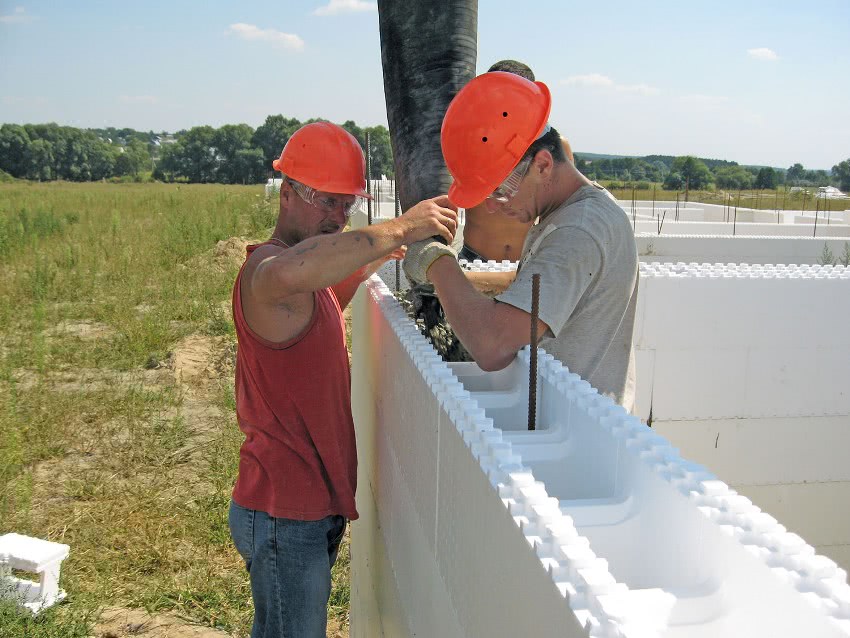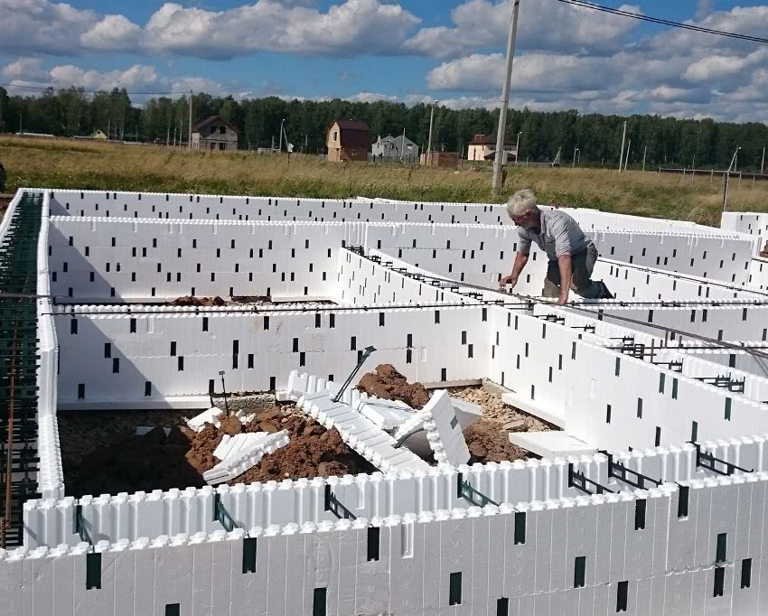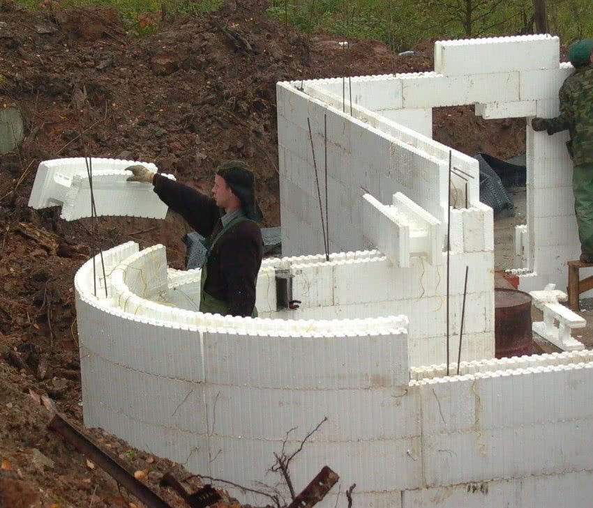 Очень качественный и практичный вариант. Опалубка собирается из готовых отдельных блоков пенополистирола. Элементы опалубки предельно просты в монтаже. Их можно безо всяких проблем обрабатывать под требуемую форму.