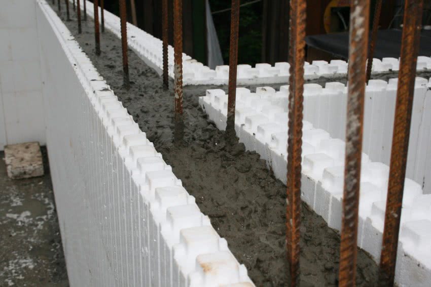 Заливка раствора. Перед началом заливки своими руками несъемной опалубки рекомендуется позаботиться о прокладке коммуникаций внутри формирующей конструкции. Цементный раствор, используемый для формовки опалубки, не должен содержать посторонних добавок и примесей (например, щебня). Сама операция осуществляется довольно просто. Заливка выполняется пошагово, причем высота слоя бетона не должна превышать 1 м. Этот показатель соответствует размерам 3-4 несъемных блоков конструкции.
