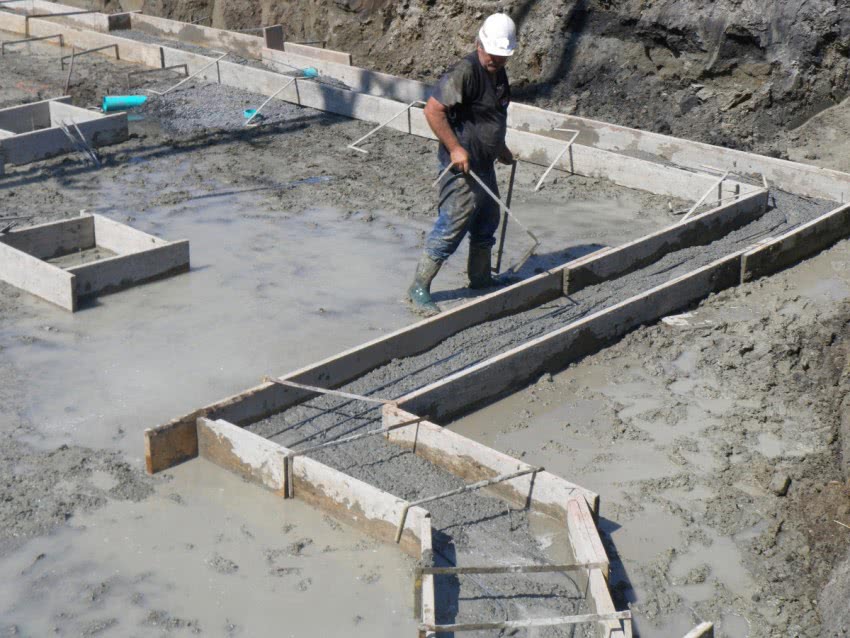 - После устройства каркаса выполняют заливку фундамента бетоном.