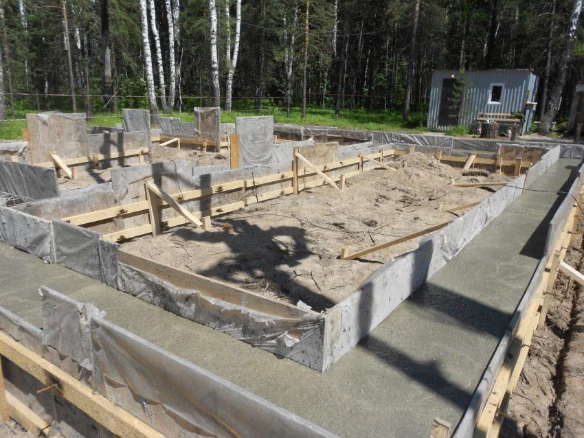 В жаркую погоду, бетонную поверхность необходимо время от времени увлажнять – этим вам удастся избежать образования корки, мешающей застыть более глубоким слоям фундамента. Если погода дождливая – накройте фундамент пленкой, в противном случае он может размокнуть.