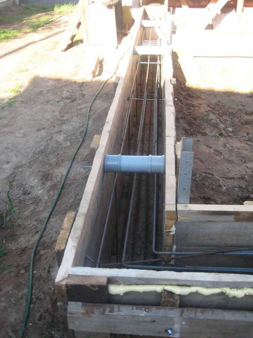 При установке конструкций опалубки, в местах, где планируется провести коммуникации (трубопроводы, кабели) через фундамент, необходимо установить трубы диаметром 100 мм.