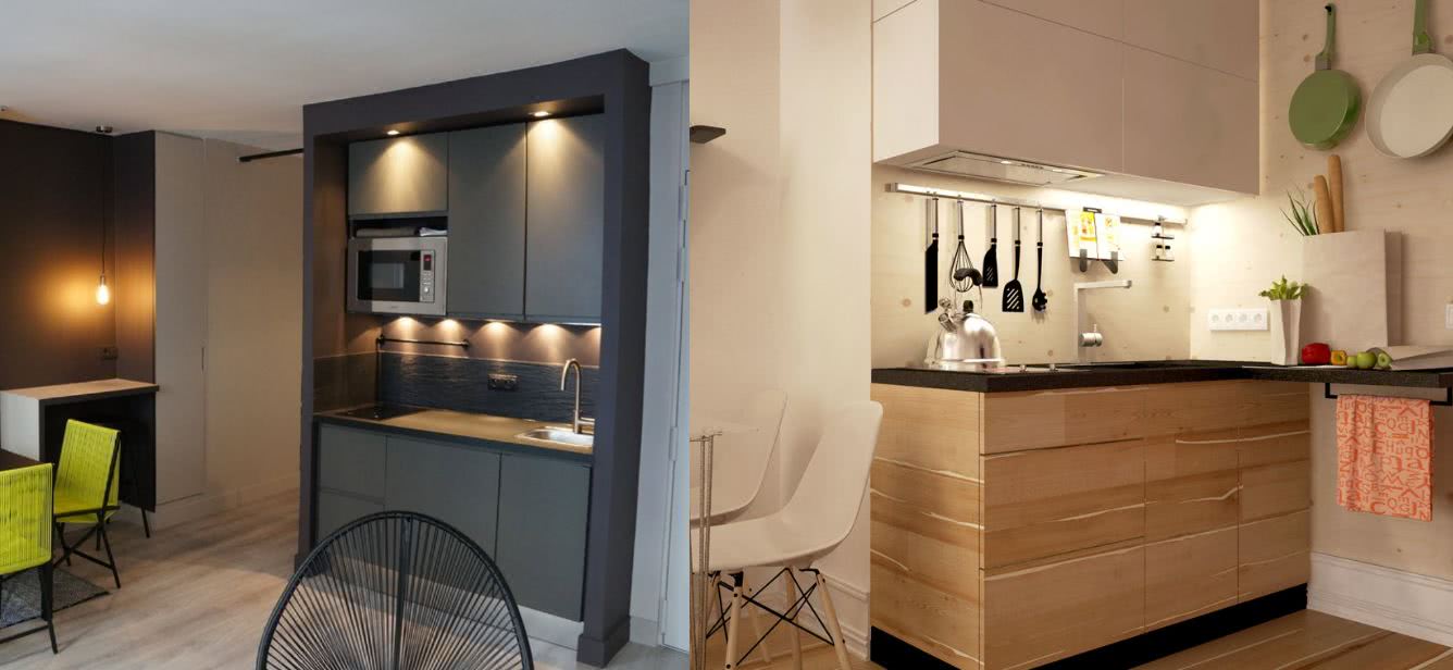 Это дополнительное помещение, которое может использоваться для приготовления пищи, но обеденная зона здесь не предусмотрена. Здесь обязательно должна быть плита и вытяжка. Зачастую подобные кухни проектируются в новых однокомнатных квартирах, чтобы не разделять жилую часть помещения от кухонной.