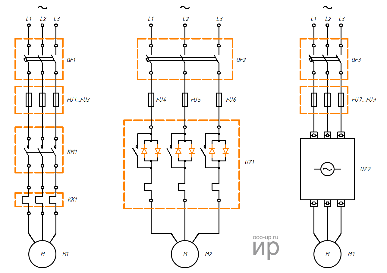 Варианты подключения асинхронного электродвигателя с помощью магнитного пускателя (слева), устройства плавного пуска (посеридине) и частотного преобразователя (справа). Схемы представлены в упрощенном виде. FU1-FU9 — плавкие предохранители, KK1 — тепловое реле, KM1 — магнитный пускатель, L1-L3 — контакты для подключения к сети трехфазного переменного тока, M1-M3 — асинхронные электродвигатели, QF1-QF3 — автоматические выключатели, UZ1 — устройство плавного пуска, UZ2 — преобразователь частоты