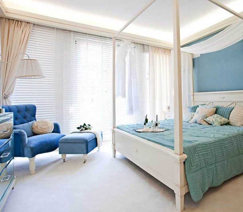 Голубые. Шторы такого цвета, также как и зеленые, являются одним из самых оптимальных вариантов оформления спальни. Уместны в синем, золотом, белом, бежевом интерьере.