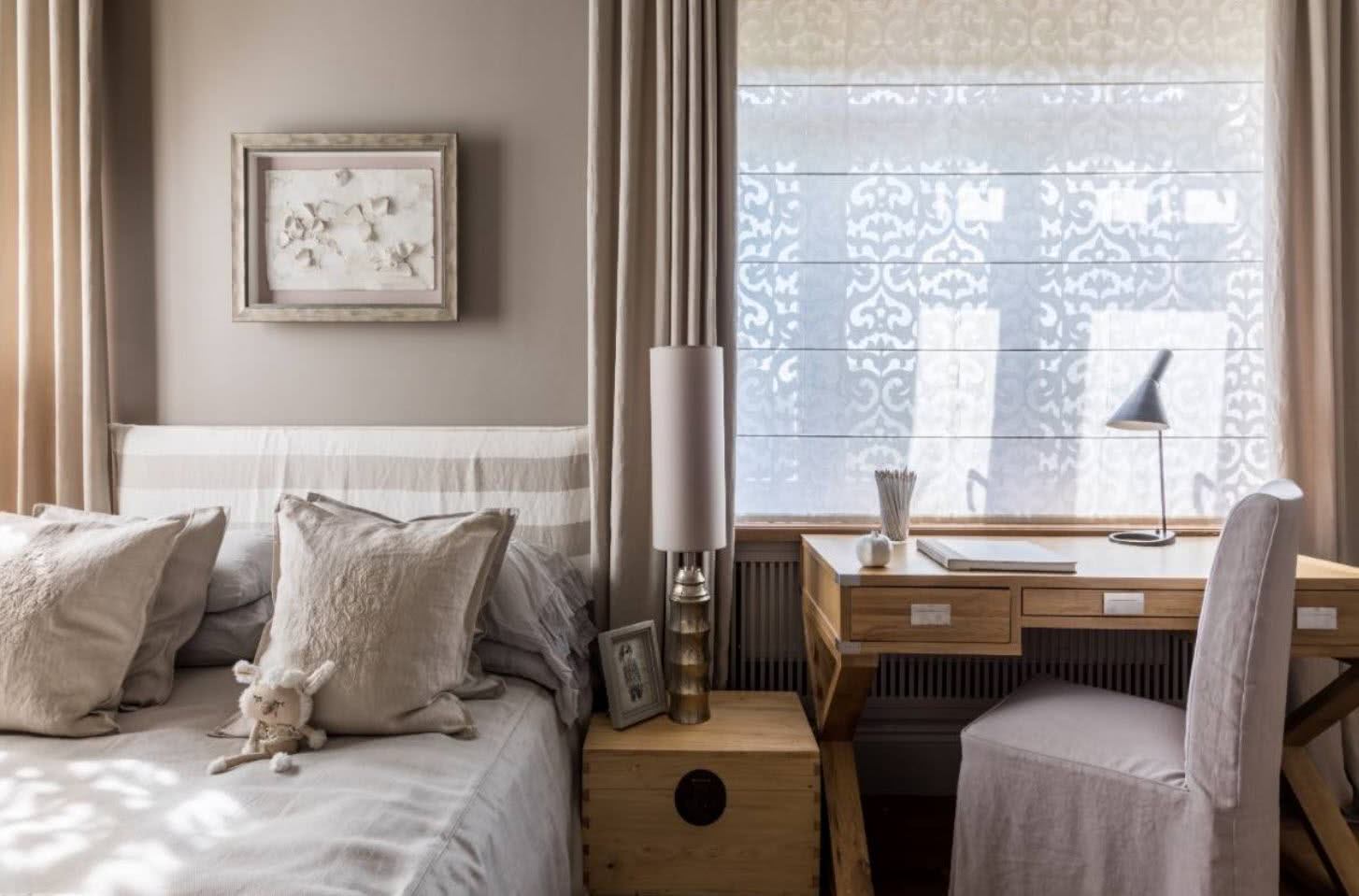Для спальни важно, чтобы шторы при необходимости могли создавать в помещении комфортное для сна затенение, но «австрийки» занавески часто шьют из неплотной, пропускающей свет ткани. В этом случае им отводится роль гардин и их комбинируют с плотными шторами