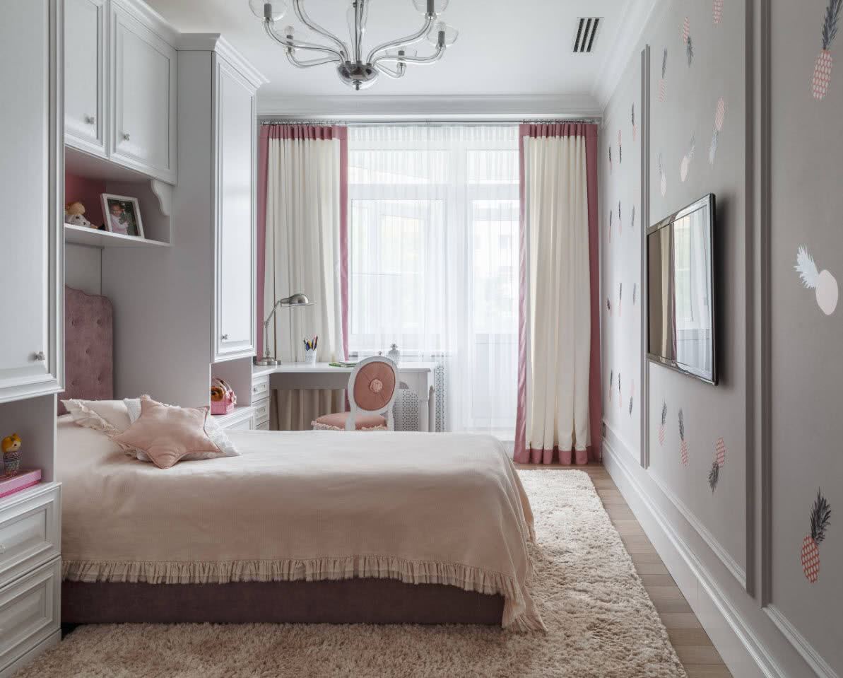 Для узкого окна спальни лучше подобрать воздушный тюль и плотные однотонные портьеры с подхватами и ламбрекеном. Этот дизайнерский прием визуально расширит оконный проем и станет оптимальным решением проблемы.