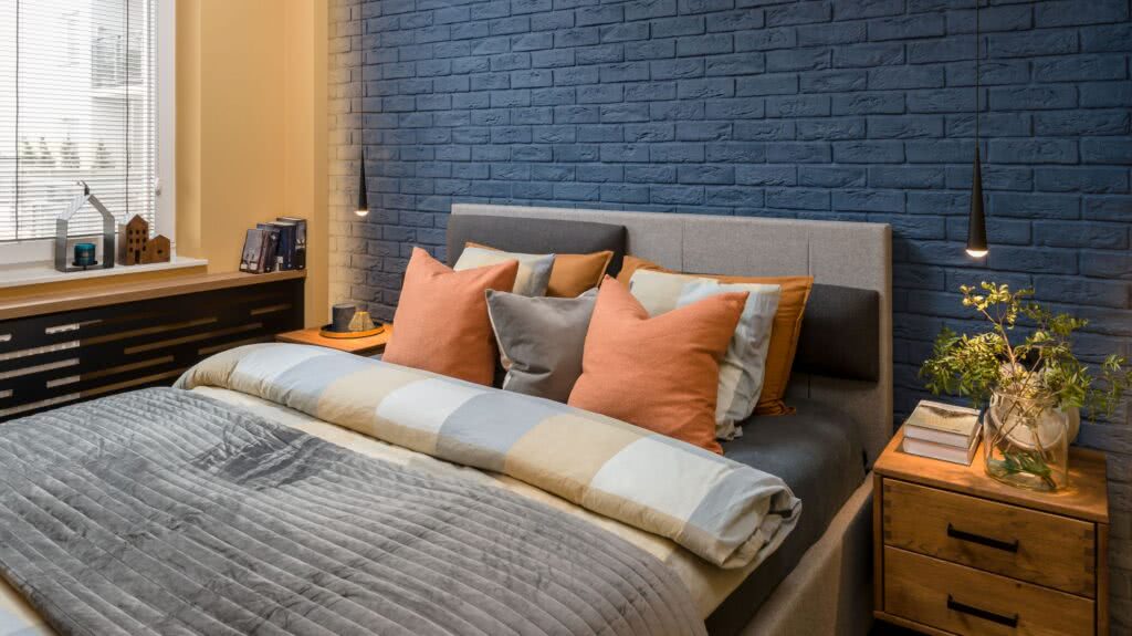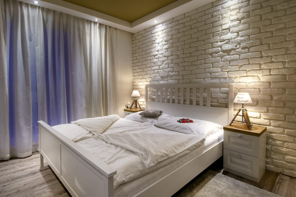 Палитра зависит от оттенка стен. Так, белый кирпич отлично сочетается со всеми цветами, но лучше придерживаться светлой гаммы, которая визуально наделит комнату светом. Красный кирпич выглядит основательно и вступит в «союз» со сдержанными, естественными оттенками.