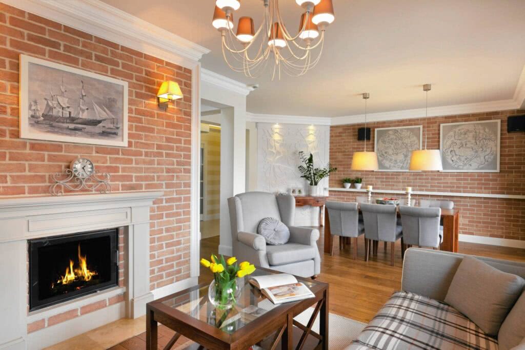 Дух старины подчеркивается оформлением кирпичом пространства возле камина, простенков между оконными проемами и даже центральной стены. Кроме стен, кирпич может быть задействован в перегородках, каминах, и т.д.