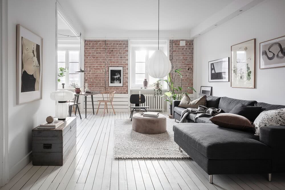 Есть много возможностей. Белая кирпичная стена создаст вневременную композицию с серым цветом. Вы можете выбрать темный антрацит или светло-серый. Серый в сочетании с белым кирпичом станет основой интерьера в скандинавском или современном стиле.