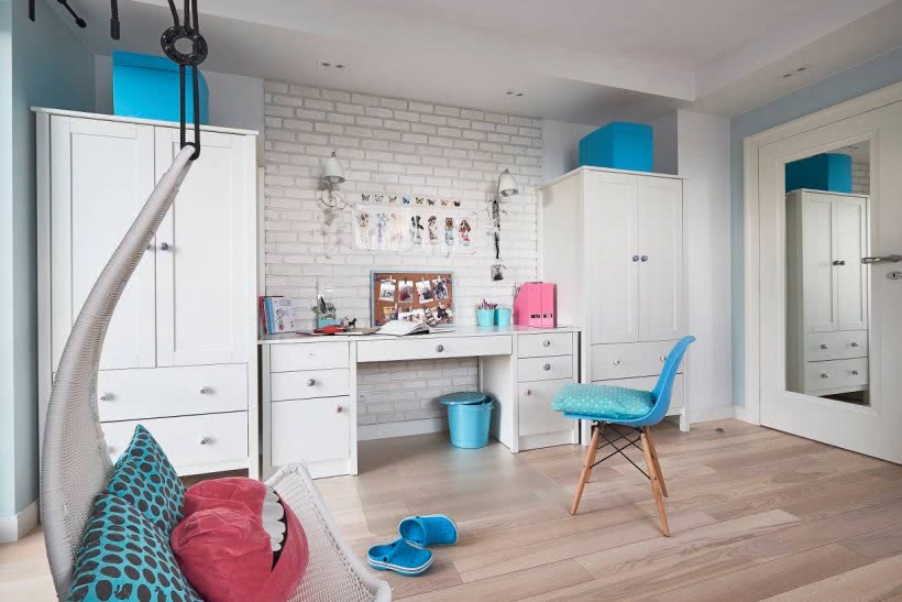 - Отделка белым кирпичом также хорошо подойдет в комнате подростка, особенно если там стоит мебель, отличающаяся строгим дизайном,