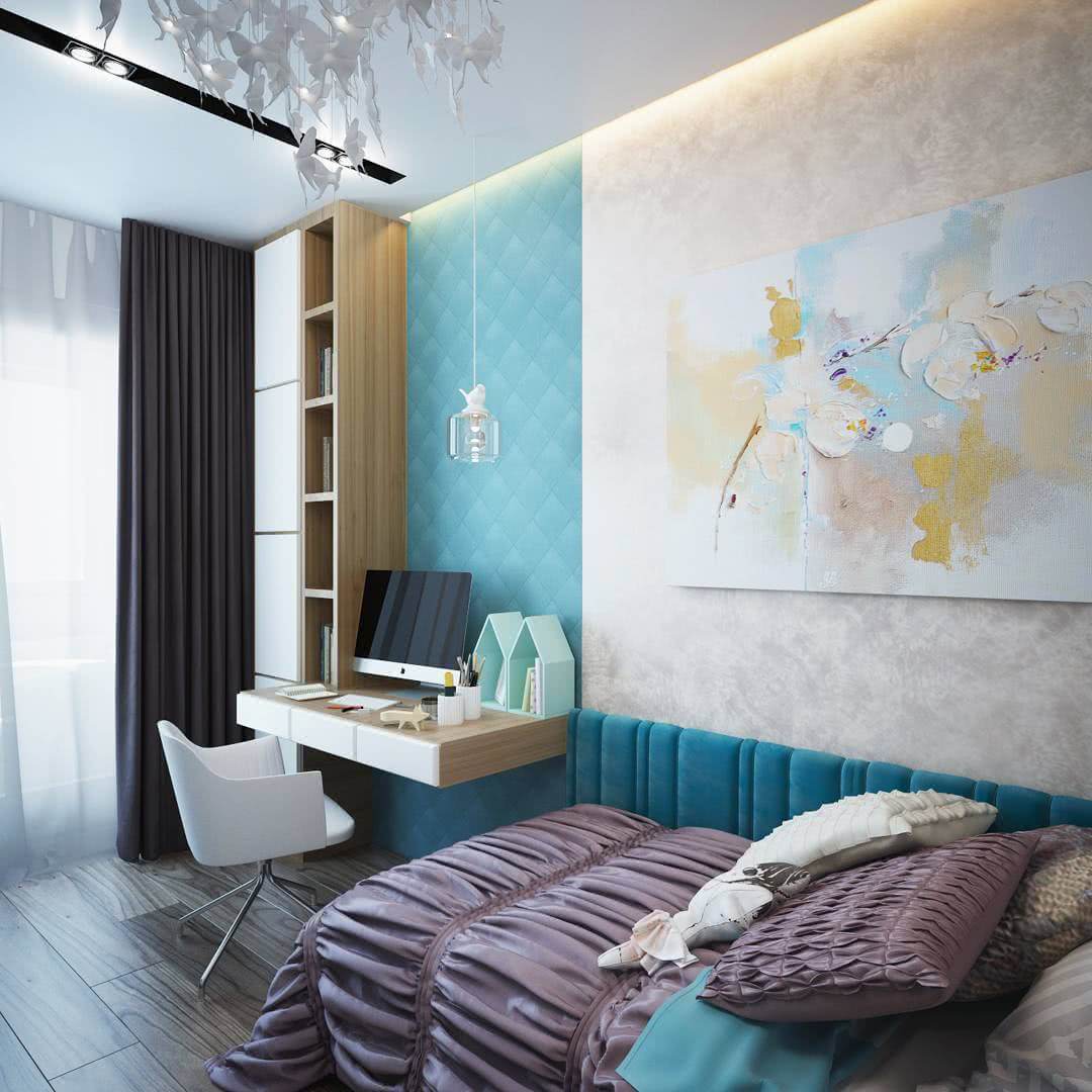 Детская. Не смотря на то, что бирюзовый благоприятно влияет на психику человека, психологи не рекомендуют использовать данные тона в оформление детской, так как это может оказать влияние на активную деятельность и характер детей. В комнате для детей можно использовать лишь яркие вставки бирюзы в комбинации с другими яркими цветами.