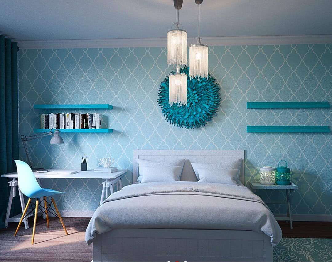 Бирюзовый цвет в интерьере этой комнаты — находка. Особенно хорошо он выглядит в просторных, хорошо освещенных помещениях. Солнечные лучи будут красиво играть на стенах, оформленных нежно-бирюзовыми обоями. Такая обстановка способствует полноценному сну и заряжает энергией в дневное время суток.