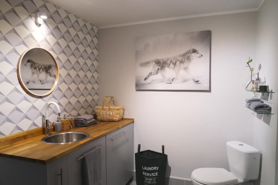 Оригинальный дизайн ванной комнаты с использованием фотообоев